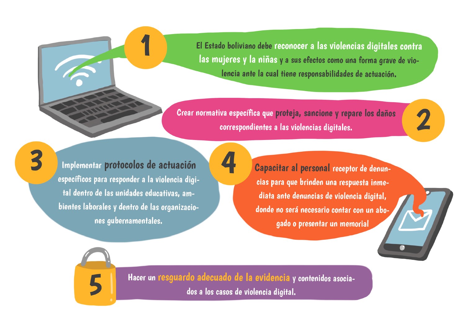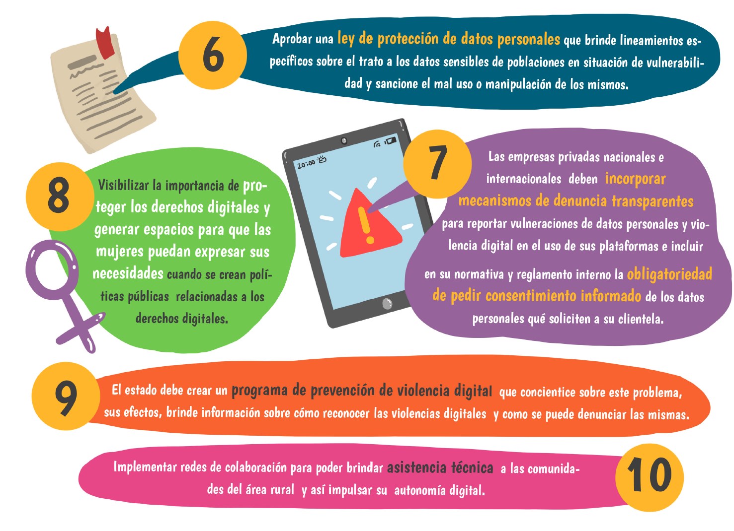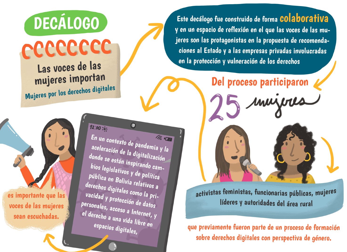 Este decálogo fue construido de forma colaborativa y en un espacio de reflexión en el que las voces de las mujeres son las protagonistas en la propuesta de recomendaciones al Estado y a las empresas privadas involucradas en la protección y vulneración de los derechos digitales.