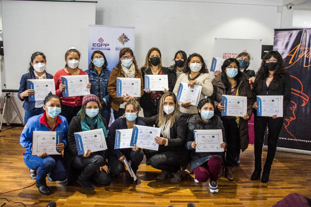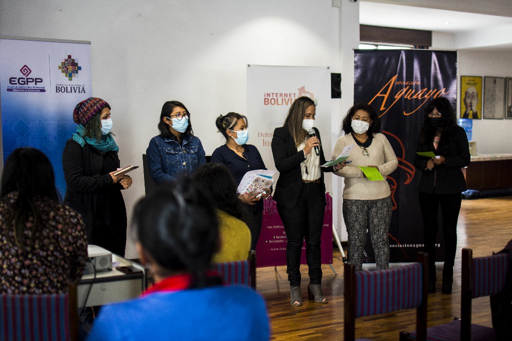 En el marco de los objetivos del proyecto la Asociación Aguayo y la Fundación InternetBolivia.org en coordinación con la Escuela de Gestión Pública Plurinacional, realizó el curso virtual «Derechos Digitales con perspectiva de género» en el que participaron funcionarias públicas, mujeres activistas y dirigentes del área rural. Tuvimos más de 700 postulaciones y más de 100 mujeres participaron del curso.